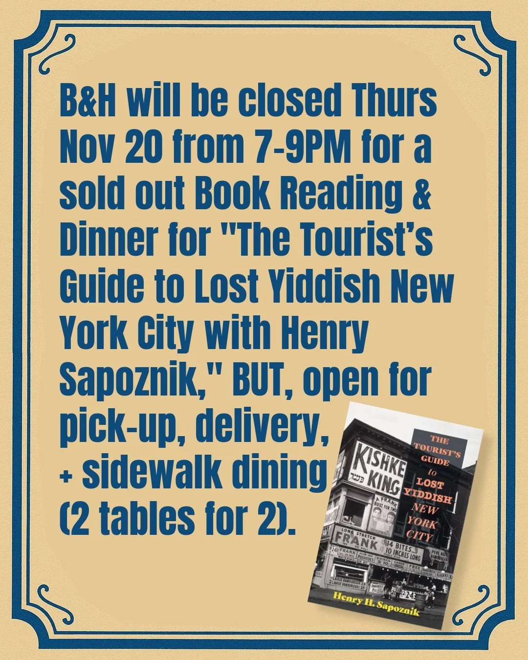 B&H is located across from the historic Orpheum Theater (former home of βSTOMPβ). Years ago, this section of Second Avenue was known as Yiddish Broadway. In 2017, B&H Dairy was honored with a Village Award by the Greenwich Village Society for Historic Preservation.